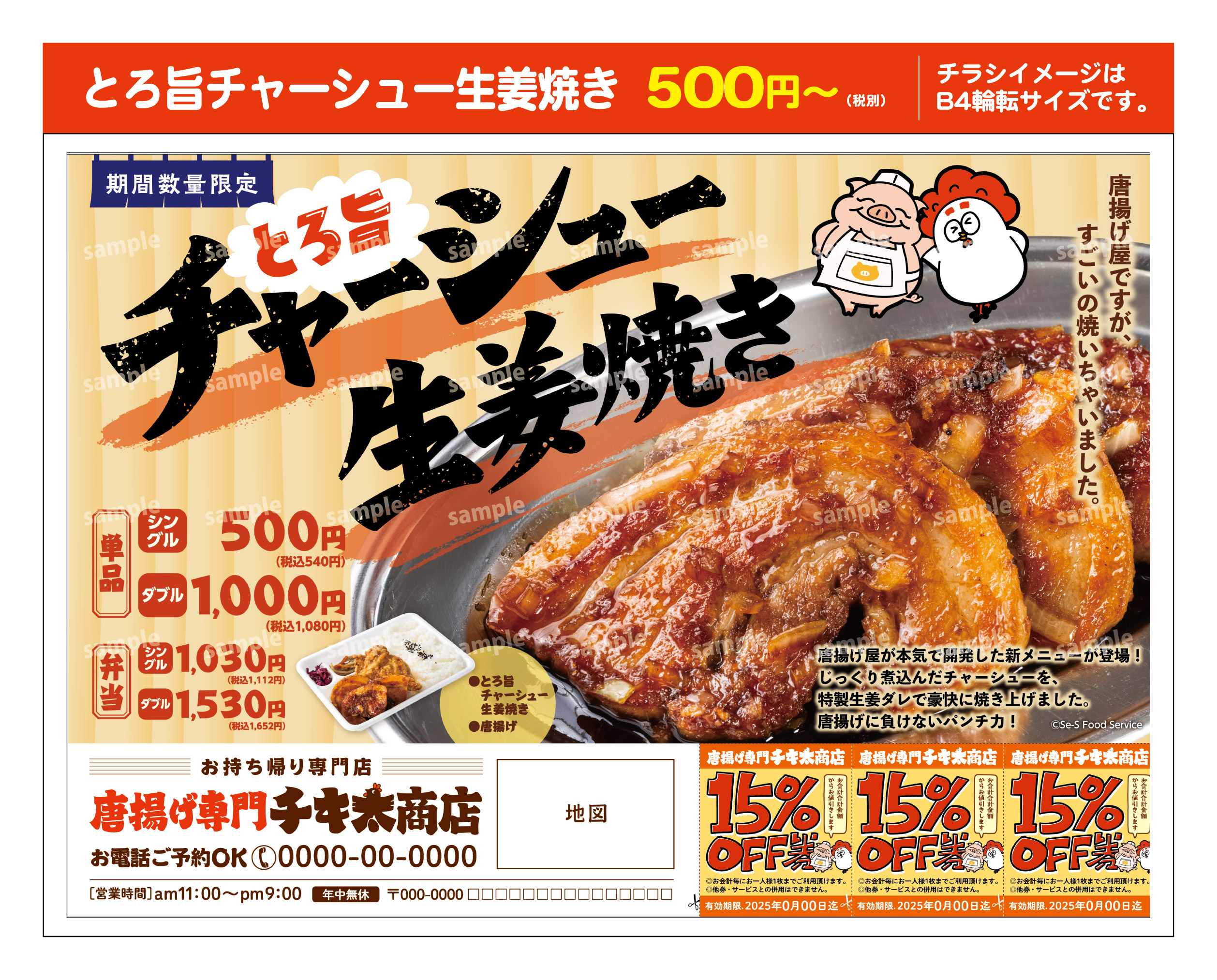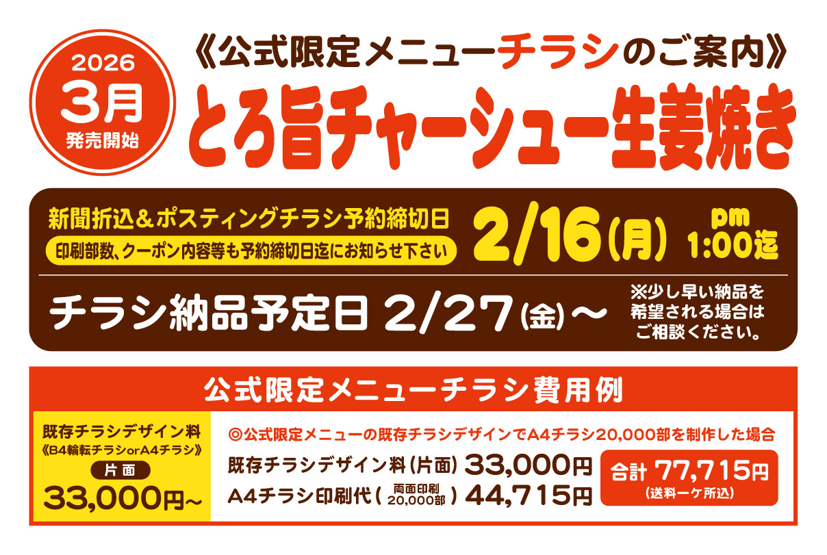 公式限定メニュー(とろ旨チャーシュー生姜焼き)-折込チラシ ▼大きな画像で確認 450円(税抜) 500円(税抜) ご注文フォーム 本フォームよりご連絡いただいた内容で、メールにてお見積りを作成してお送りいたします ▼ ご注文内容 必須ご希望のチラシ A4チラシB4輪転チラシ(二つ折り加工無し)B4輪転チラシ(二つ折り加工有り)※ポスティングをされる場合は二つ折り加工必須 必須印刷部数 ※A4チラシは30,000部までは1,000部単位、30,000部以上は5,000単位でご入力ください。 ※B4輪転チラシは1,000部単位でご入力ください。 必須チラシに掲載する店舗名 —以下から選択してください—前回と同じ変更する 今回掲載する支店名をすべてご記入ください 支店名① 支店名② 支店名③ 必須クーポン部分の内容 —以下から選択してください—前回と同じ変更する 前回ご依頼いただいたメニュー名 ▼お選びください蔵出しみそバター麻辣マヨ青唐マヨリッチレモン油淋鶏スパイシーカレーのり塩コンソメリッチネギみそトリュフハニーマスタードバッファローその他 その他の方は商品名をご記入ください クーポンの場合は有効期限をご記入ください 今回掲載する内容をお選びください —以下から選択してください—クーポンLINE公式アカウント求人広告その他 ■ クーポン(左)の内容 —以下から選択してください—前回と同じ内容10%OFFに変更15%OFFに変更20%OFFに変更その他 クーポンの有効期限 通信欄 ■ クーポン(中央)の内容 —以下から選択してください—前回と同じ内容10%OFFに変更15%OFFに変更20%OFFに変更その他 クーポンの有効期限 通信欄 ■ クーポン(右)の内容 —以下から選択してください—前回と同じ内容10%OFFに変更15%OFFに変更20%OFFに変更その他 クーポンの有効期限 通信欄 ■ 掲載内容 —以下から選択してください—前回と同じ内容内容を変更する ■ 変更内容 ■ 掲載内容 —以下から選択してください—前回と同じ内容内容を変更する ■ 変更内容 ▼ 納品先① 必須店名/社名 必須担当者名 必須TEL 必須郵便番号 必須都道府県 必須ご住所 必須納品締切日 必須納品部数 必須納品先情報 上記1カ所に送る複数に分けて送る 送料について ● A4チラシは、送料1ヶ所込み。2ヶ所目から別途送料がかかります。 ● B4輪転チラシは納品先ごとに別途送料がかかります。 ▼ 納品先② ※ 2か所目の納品先を希望される場合は以下のすべてにご記入ください 店名/社名 担当者名 TEL 郵便番号 都道府県 ご住所 納品締切日 納品部数 ※複数のお届け先をご指定の方で、総印刷部数と、各納品先への印刷部数の合計数とが異なる場合は、余剰分を納品先①に追加してお送りいたします ▼ 納品先③ ※ 3か所目の納品先を希望される場合は以下のすべてにご記入ください 店名/社名 担当者名 TEL 郵便番号 都道府県 ご住所 納品締切日 納品部数 通信欄・備考 ※ 納品先が4か所以上になる場合はこちらにご記入ください ▼ ご注文者様情報 必須店舗名・支店名 必須担当者名 必須メールアドレス 必須TEL 任意通信欄 Δ